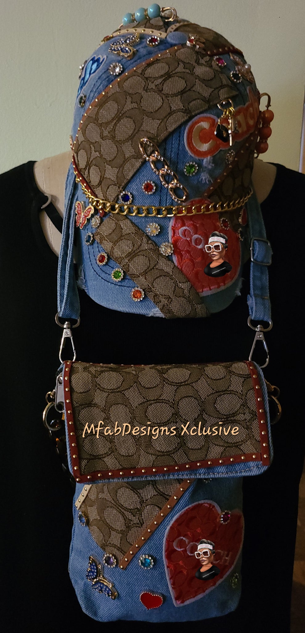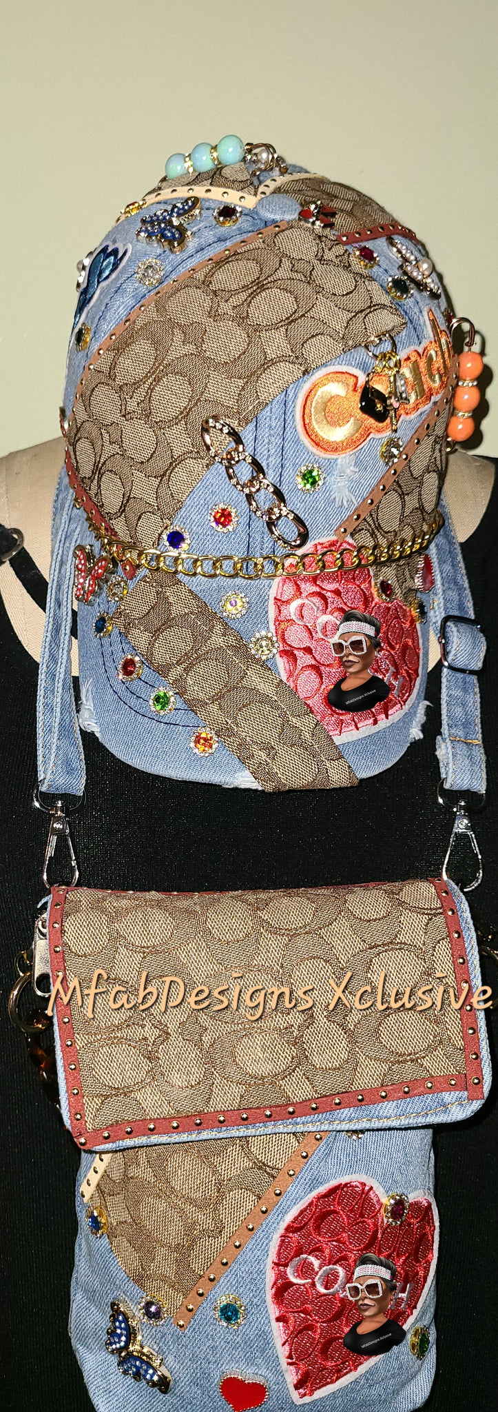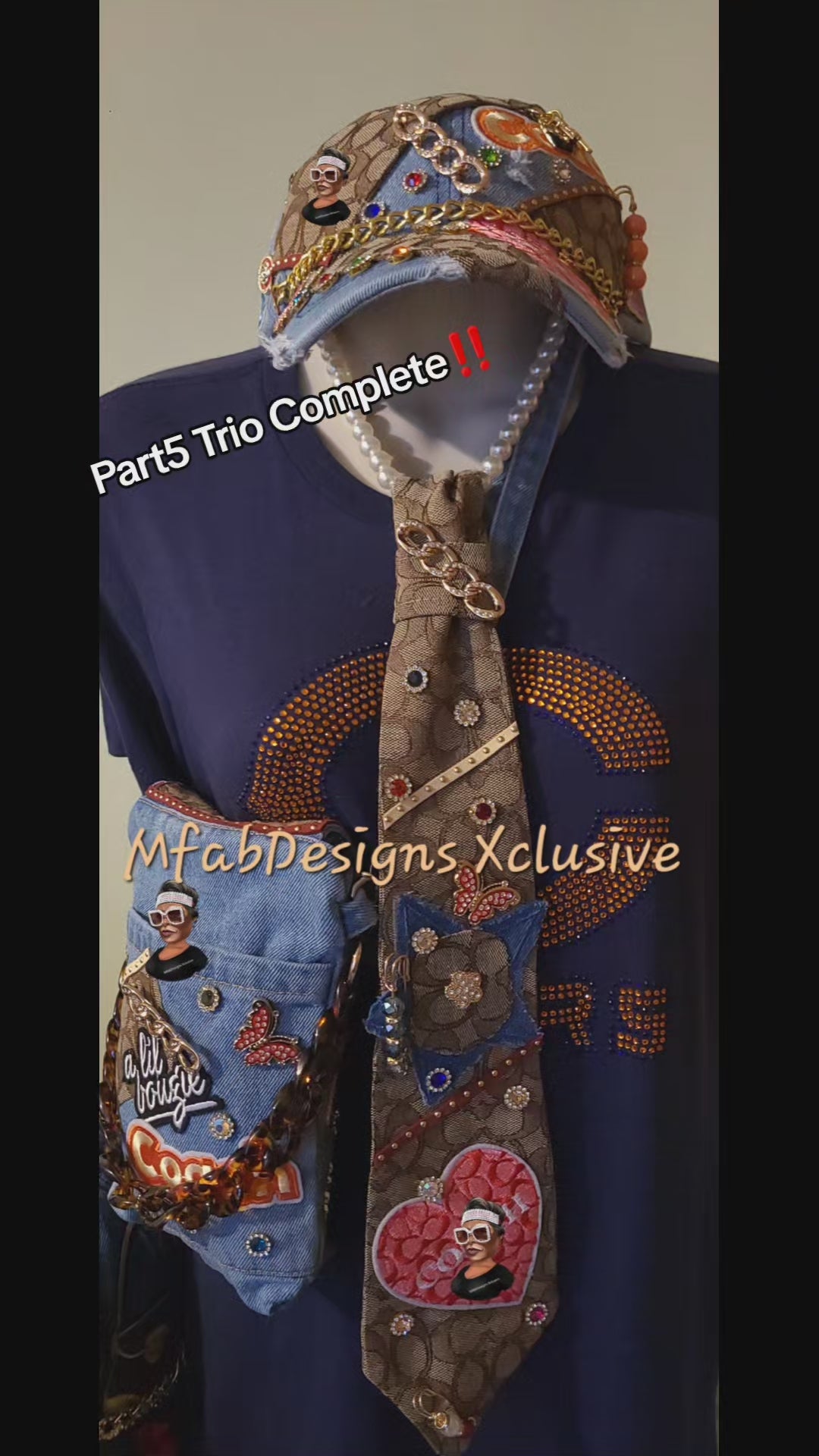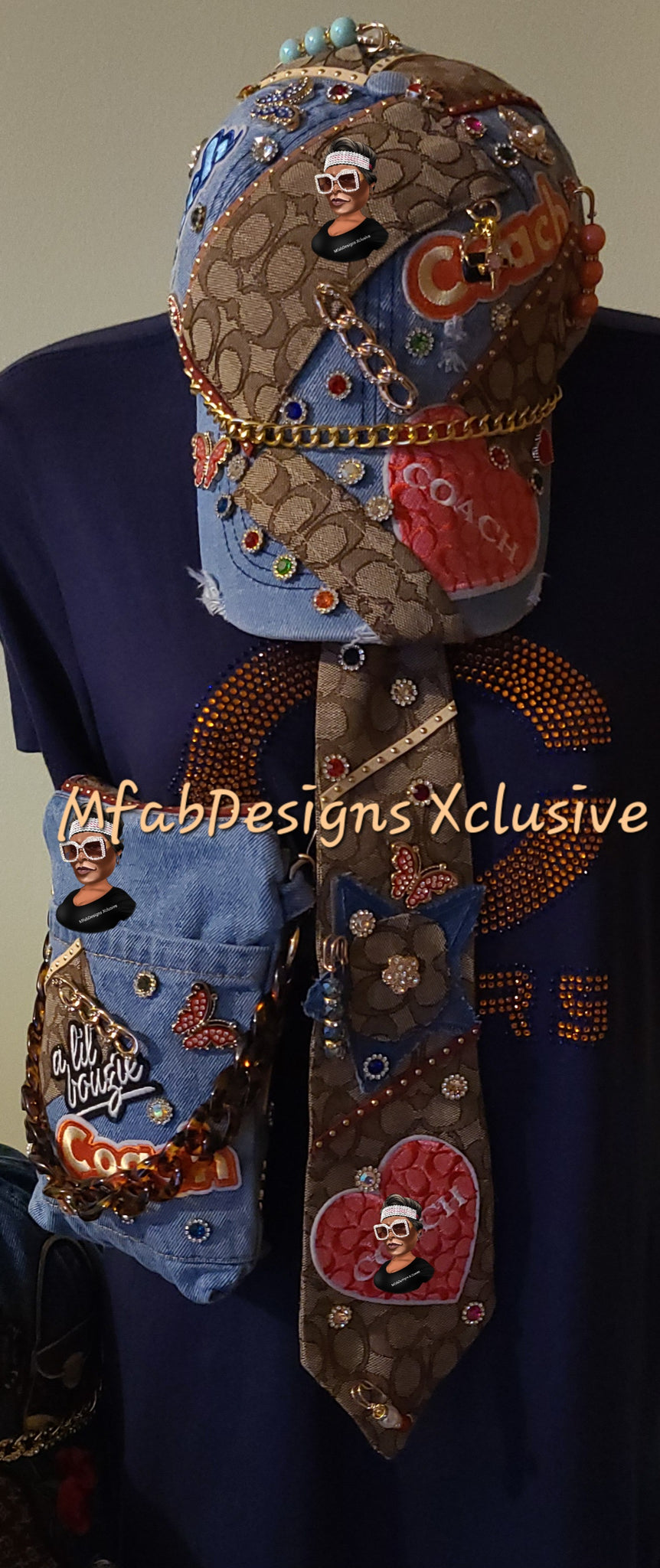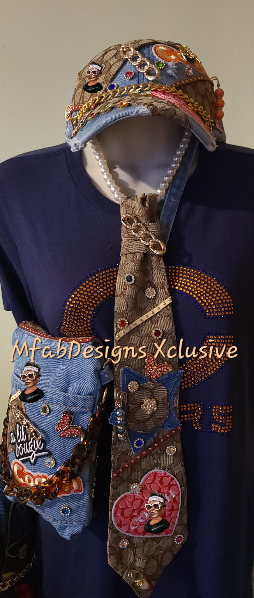 Carmel and Denim Patchwork and Junk Trio. Custom by MfabDesigns Xclusive. Deming cap w/All the Fly trimmings that is Xclusive and one of a kind. Denim Crossbody with snap closure added,bag chain,patches and all the bells and whistles added. Adjustable strap. Custom Tie with Denim and Accessories that are sure to turn heads. All Sales are Final. All items are handcrafted and Imperfections and slight Variations are normal, but Quality and Highest grade of materials are not sacrificed. No Refunds or Exchanges on Custom Apparel.