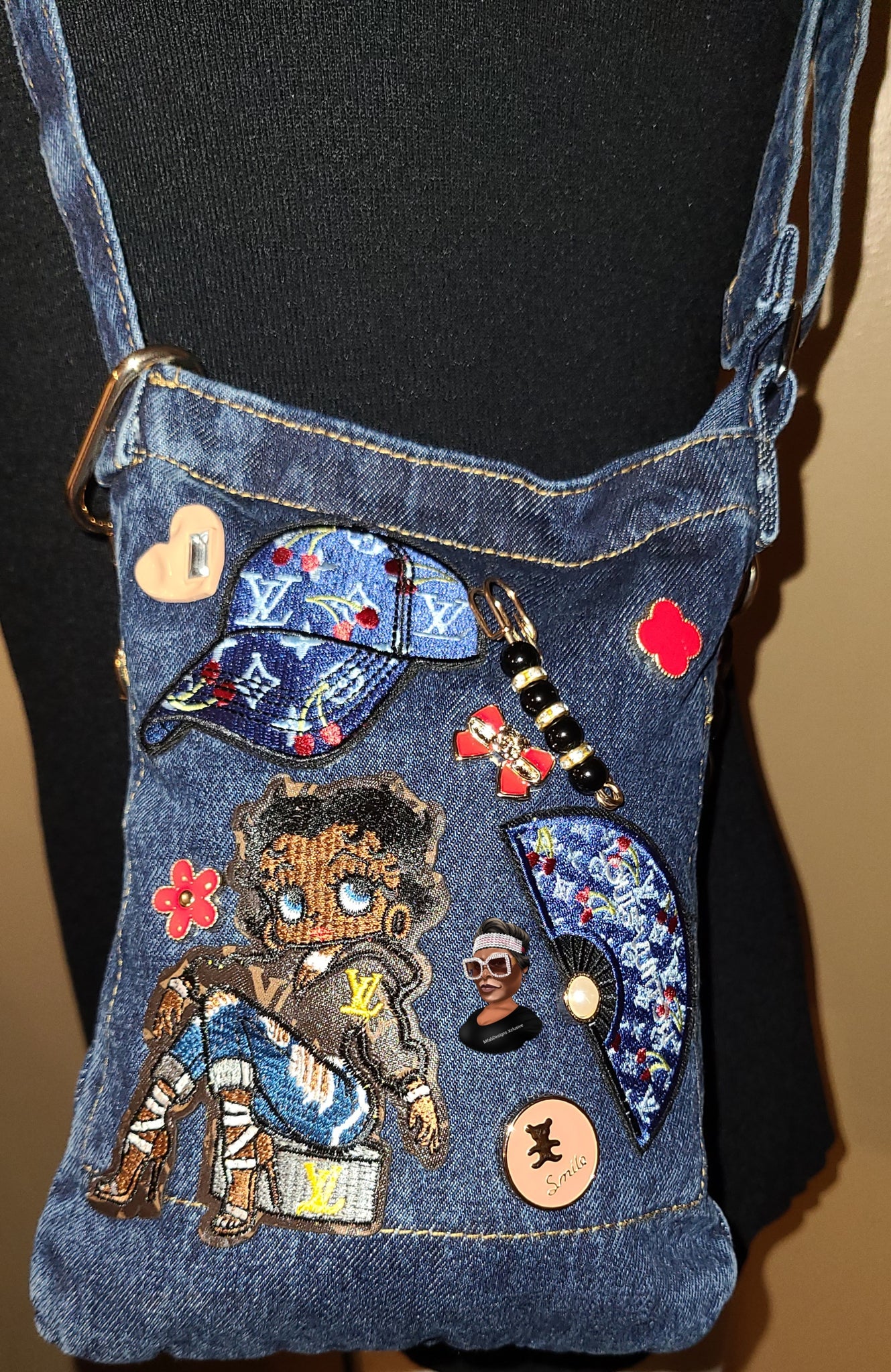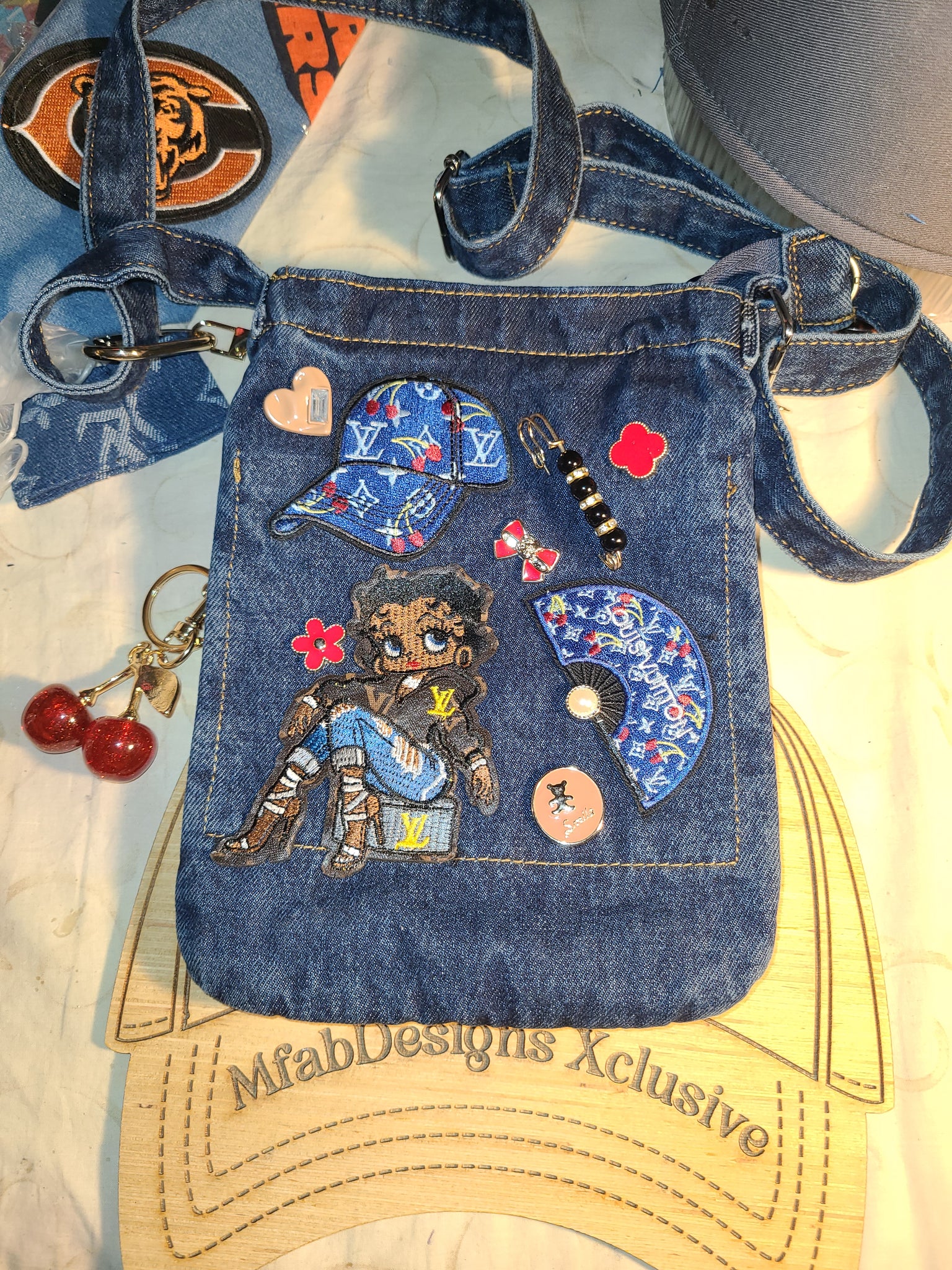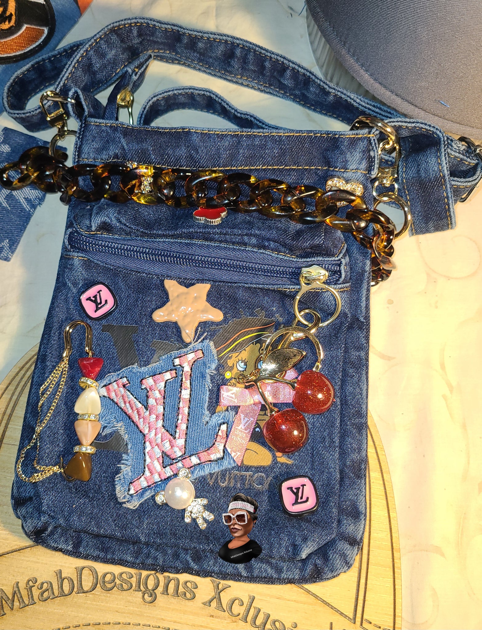 Custom Denim Crossbody Remix. MfabDesigns Xclusive. Bag Chain, bag charm, patches and accessories added. Custom Handcrafted. Slight Imperfections and Variations are Normal. The Highest Quality of Materials were used. (Pockets, Bows, xtralrg bow brooches,Custom Ribbons, and or Denim Patches are Xtra) All Sales are Final. No Exchanges or Refunds on Custom Apparel.