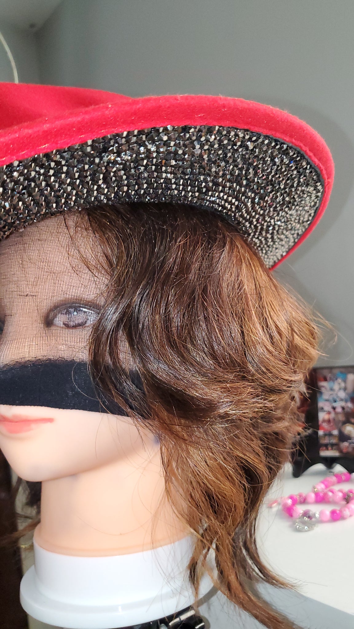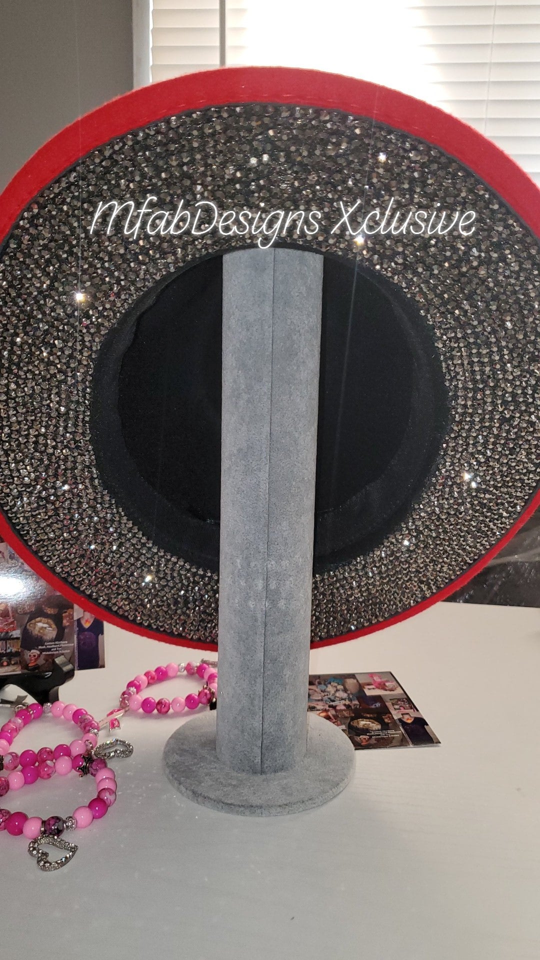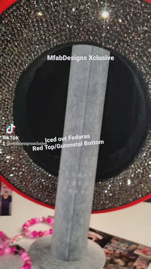 Iced out Fedora with High Quality Stones. Red Top and Gunmetal Bottom.(Gunmetal Rhinestones) The Bling and Shine is Bright like a Diamond. The craftsmanship is top quality and handcrafted. On-site fits most!